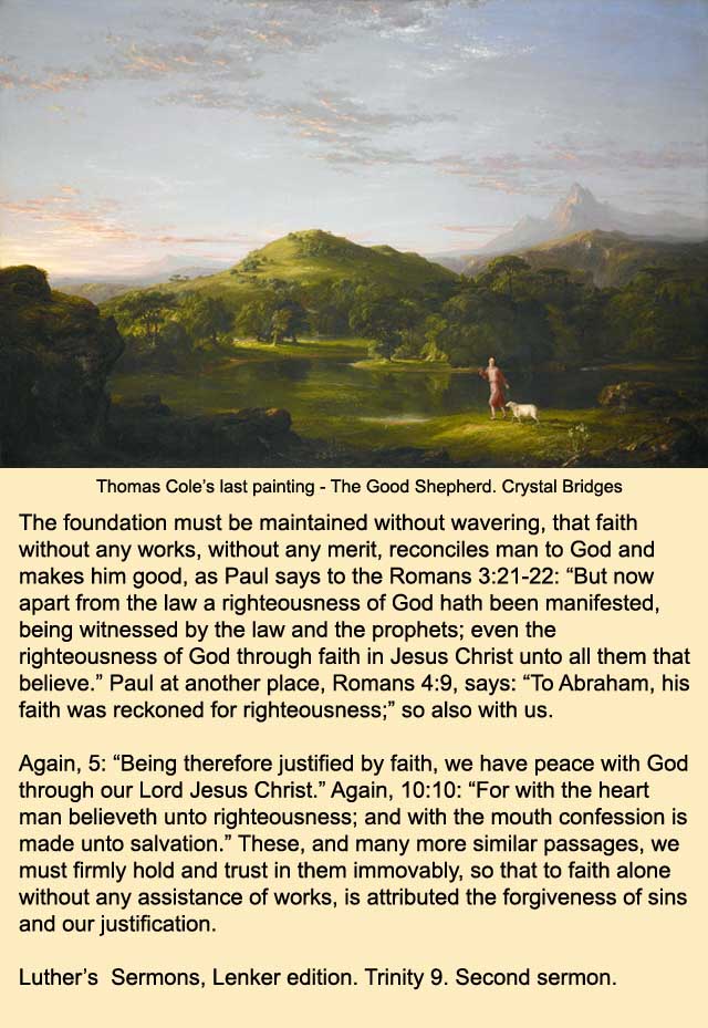 4. The foundation must be maintained without wavering, that faith without any works, without any merit, reconciles man to God and makes him good, as Paul says to the Romans 3:21-22: “But now apart from the law a righteousness of God hath been manifested, being witnessed by the law and the prophets; even the righteousness of God through faith in Jesus Christ unto all them that believe.” Paul at another place, Romans 4:9, says: “To Abraham, his faith was reckoned for righteousness;” so also with us.