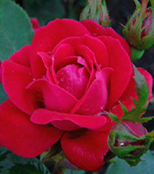 Veterans Honor looks velvety in the garden, not just red but RED! The rose glows in the middle of the greenery. |