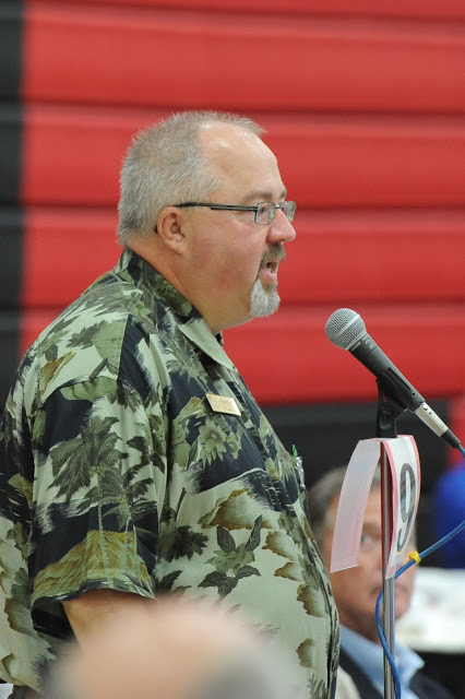 | Roused from his nap watching Packer re-runs, Martin Luther College Dean Schone rushed to the WELS convention mike. The delegate's look says, "You wore that?!" |