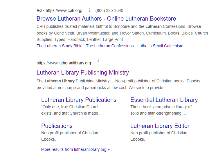Notice CPH is ahead at first glance, but Lutheran Library is the top search result without a paid ad.