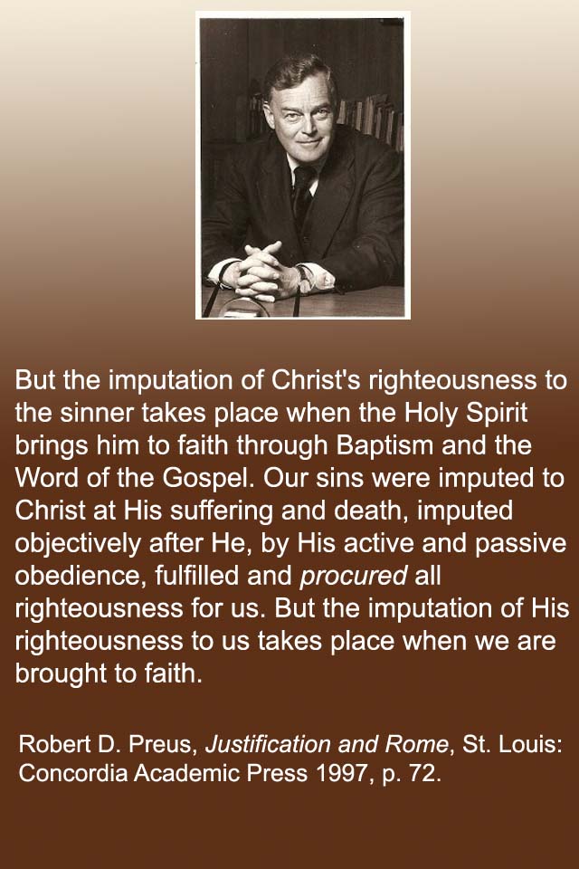 | Rolf Preus used to declare "raised for our justification" by itself until I repeated Romans 4:24 with 4:25...many times. He seems to have stopped mentioning Justification and Rome too. |